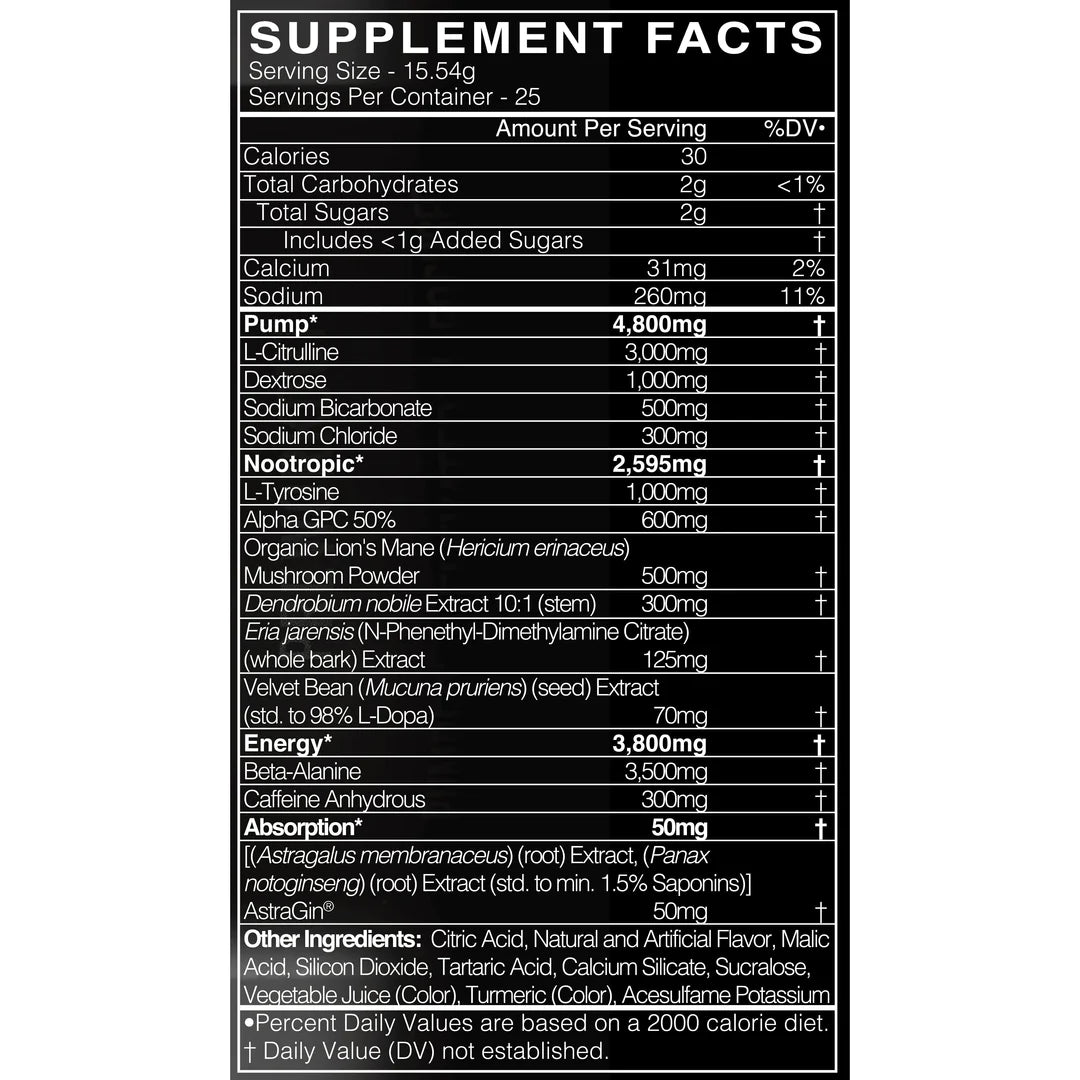Featured Ingredients: Beta Alanine, L-Citrulline, Alpha GPC 50%, L-Tyrosine, Lion's Mane (Mushroom), Dendrobium Nobile Extract 10:1, Velvet Bean Extract, 300mg Caffeine Anhydrous.