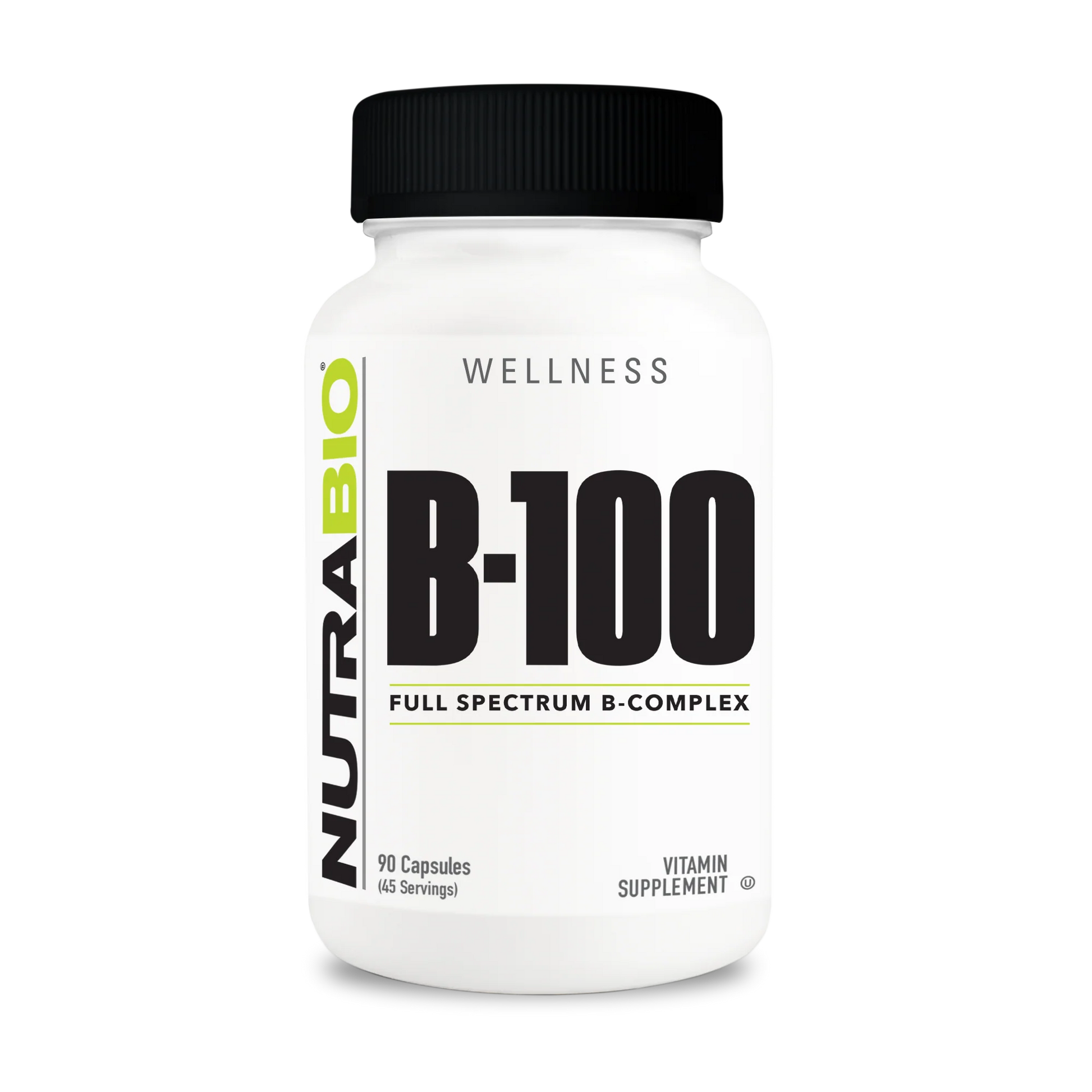 NutraBio Vitamin B-100 Complex is an all-encompassing blend of essential B vitamins, vital for maintaining a range of physiological functions. This complex includes Vitamin B1 (thiamine), B2 (riboflavin), B3 (niacinamide), B5 (pantothenic acid), B6 (pyridoxine HCl), and B12 (methylcobalamin), each contributing uniquely to support your body's health.