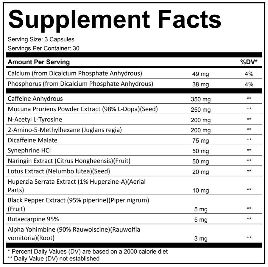 DIRECTION FOR USE: As a dietary supplement, take 1-3 capsules with 8oz. of water. To assess your tolerance, always begin use with 1 capsule. Never exceed 3 capsules in 4 hours period, or 6 capsules in a 24 hour period. Never take with any other product containing stimulants. Do not take within 6 hours of bedtime. *These statements have not been evaluated by the Food and Drug Administration. This product is not intended to diagnose, treat, cure or prevent any disease.