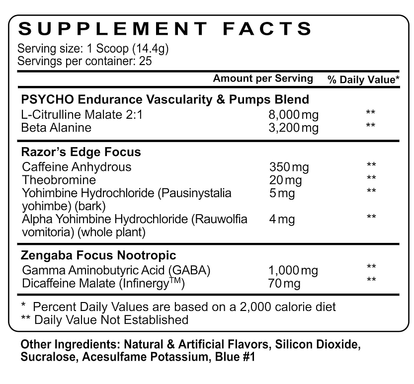 PSYCHO Endurance, Vascularity & Pumps Blend: Provides nitric oxide fueled muscle pumps with added strength, power, and endurance. The powerful combination of 3.2g Beta-Alanine, 8g citrulline malate that gives Edge of Insanity a premium pumps blend that is unparalleled to other products.