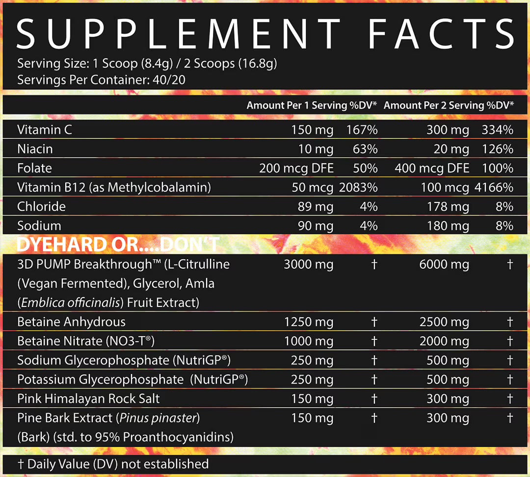 This is the final evolution in non-stimulant pump pre-workouts. FSU Dyehard™ delivers massive doses of 3D PUMP Breakthrough™, NO3-T Nitrates, NutriGP® Glycerophosphates, and more for increased muscle pumps, enhanced performance, and muscle recovery.*