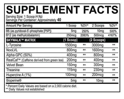 Skywalk™ is an ultra-premium focus powder containing nine highly novel compounds each dosed in their most effective amounts to serve as the lifeblood of mental drive for the individual constantly on the grind. This formula works on many different aspects towards brain optimization, such as the synthesis of powerful neurotransmitters, neuro-protectant properties, which in turn fight against mental degeneration, and increase the efficiency of communications between the brain cells.† Augment memory recall, laser focus, mental energy, stress reduction and levitate to a higher mind with the only nootropic super powder that is actually dosed effectively for results you can truly feel. With Skywalk™ you can work smarter.